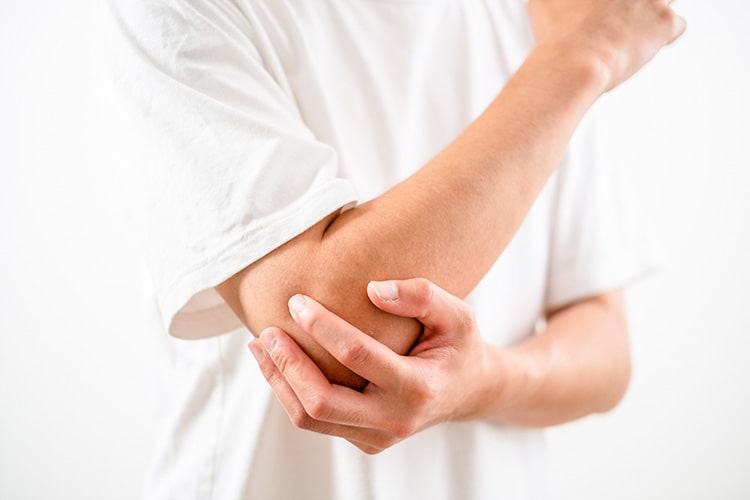 肘部管症候群は、肘の内側を通っている尺骨神経が圧迫・牽引されることによって起こる疾患です。主な症状は、くすり指の尺側や小指のしびれです。指を思い通りに動かすことができなくなったり、くすり指や小指の骨間筋が萎縮したりします。発症の原因としては、骨折などによる肘の変形、ガングリオンなどの腫瘤、靭帯の肥厚、スポーツによる傷害などが考えられます。しびれや痛みなどの症状が比較的に軽い場合は、痛み止めなどを処方し、しばらく安静にしていることで快方に向かいます。しかし、神経の圧迫によって強いしびれが生じているときは、手術が必要になります。